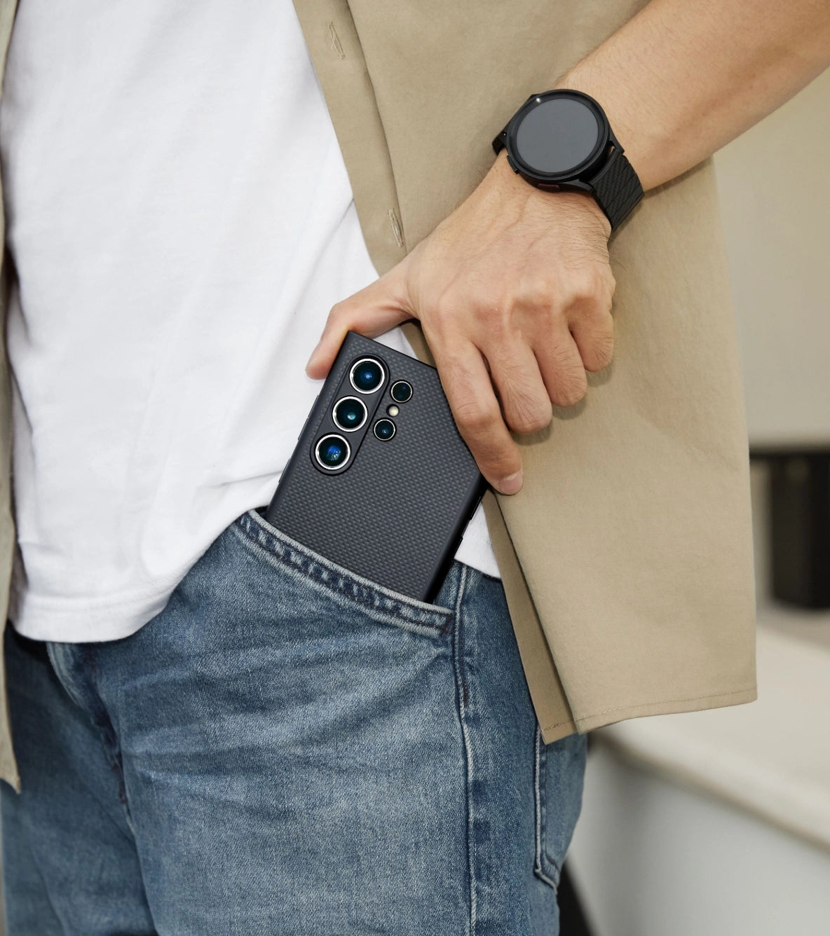 مصنوعة من ألياف الأراميد، وهي مادة قوية وخفيفة تُستخدم عادة في معدات الفضاء والجيش، توفر الحافظة قوة استثنائية وخفة ومقاومة للخدوش والتآكل وتغير اللون.